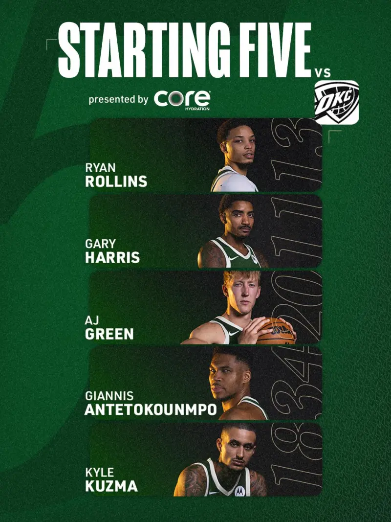 赛前,雄鹿社媒发布本场比赛的首发球员:扬尼斯-阿德托昆博、莱恩-罗林斯、加里-哈里斯、AJ-格林、凯尔-库兹马。
